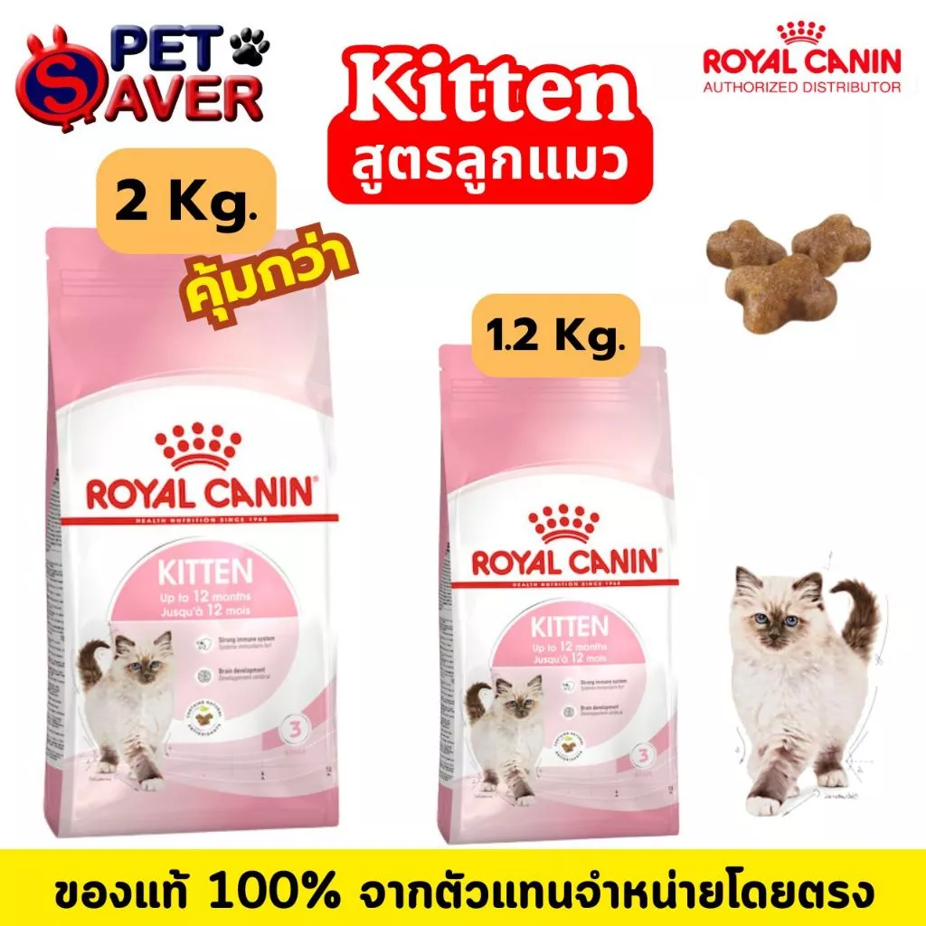 Royal Canin kitten 2kg สูตร ลูกแมว 2 kg สำหรับลูกแมว แมวเด็ก อายุ 4 - 12 เดือน โดยสูตรนี้จะดูแลการย่อยอาหาร และ การขับถ่ายเป็นพิเศษ ด้วยโปรตีนคุณภาพสูง ยอาหารจากไซเลี่ยม และพรีไบโอติกส์ (ช่วยปรับสมดุลแบคทีเรีย และปรับอุจจาระให้เป็นก้อนดี เพราะระบบย่อยอาหารของลูกแมวยังทำงานได้ไม่เต็มที่ จึงต้องเสริมการทำงานของระบบย่อยอาหาร