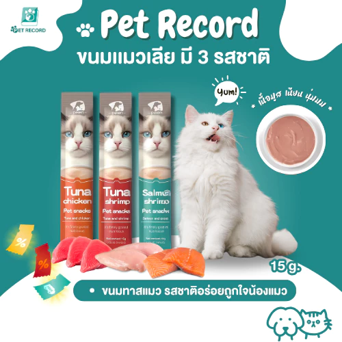 แนะนำ ขนมแมวเลีย Pet Record โปรตีนสูง 100% (ทูน่า/แซลมอน/ไก่) ลดขนร่วง บำรุงตา เกรดพรีเมียม